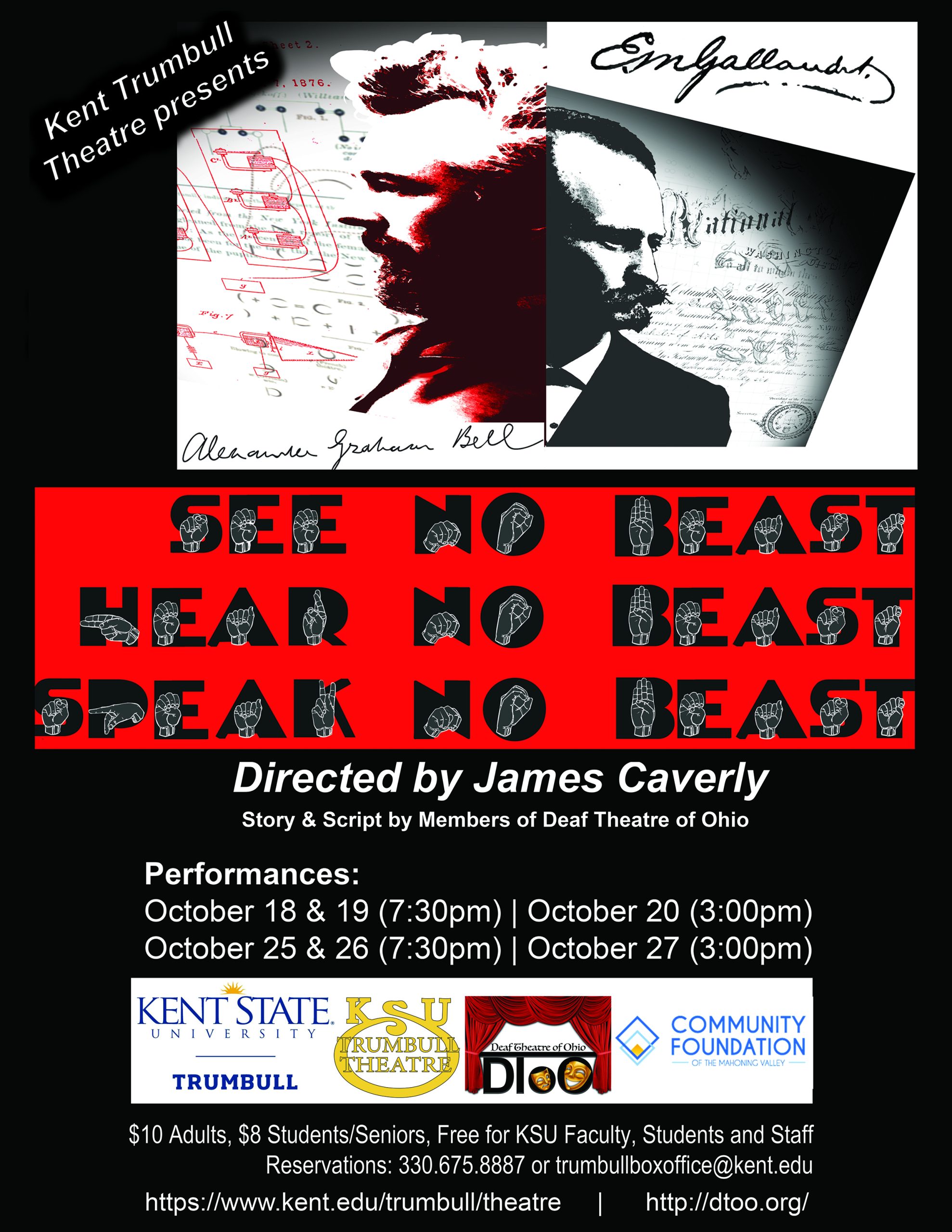Then, Kent Trumbull Theatre received support from then KSU Trumbull Campus Dean Lance Grahn to invite James (“Joey”) Caverly to serve as KSU Trumbull’s first Guest Artist. Caverly had several jobs as Guest Artist at KSU Trumbull. In addition to serving as the play’s Director, he also provided several presentations and workshops to local high schools and on the Kent and Trumbull campuses of Kent State University. Caverly also helped to create the play’s story. Caverly worked with Amauri Peters (a KSU Trumbull student), to merge the fairytale story of Beauty and the Beast with the true story of the Second International Congress on Education of the Deaf (a.k.a. “the Milan Conference”).